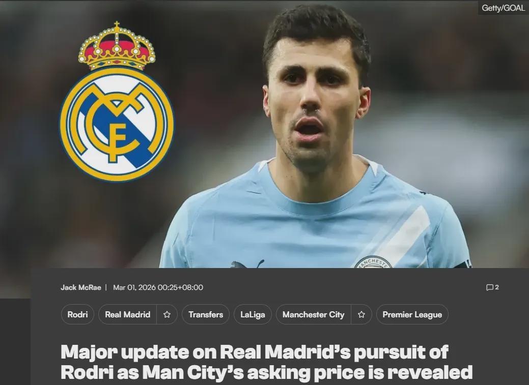 另一方面,报道称曼城对今夏出售罗德里持开放态度,并且这名球星的合同明年夏天就要到期,因此蓝月亮的要价只有5000万欧元。