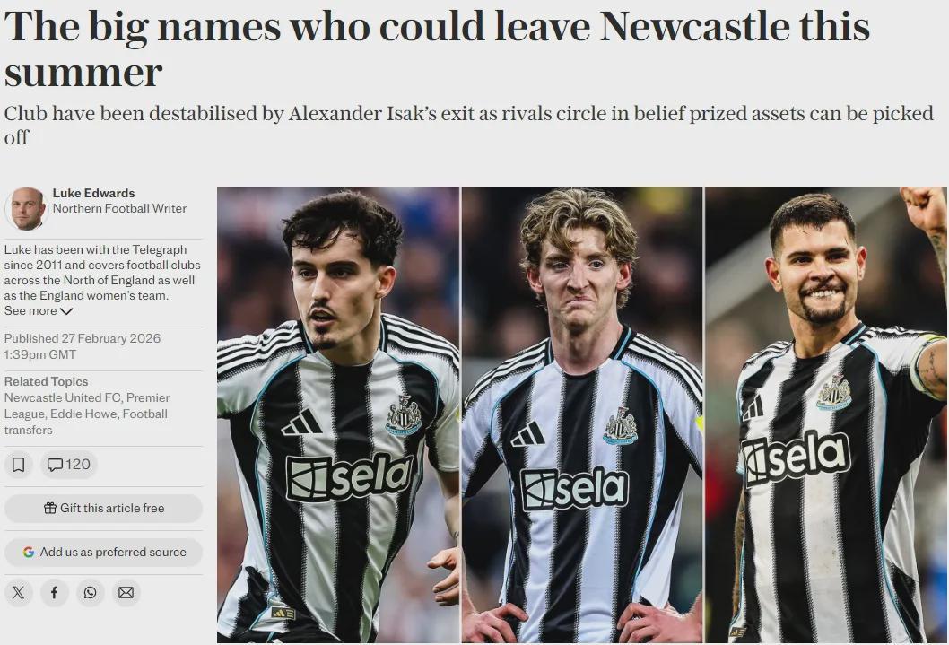 电讯报记者LE消息,今年夏天很多球星可能离开纽卡斯尔,他们已经引起了很多大俱乐部的兴趣。